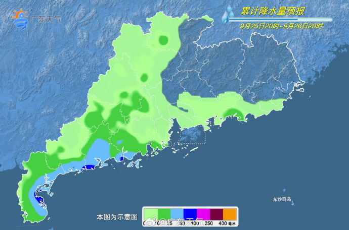 26日,粵西和珠三角的沿海市縣多雲間陰天,有雷陣雨,其餘市縣多雲,有分散陣雨。