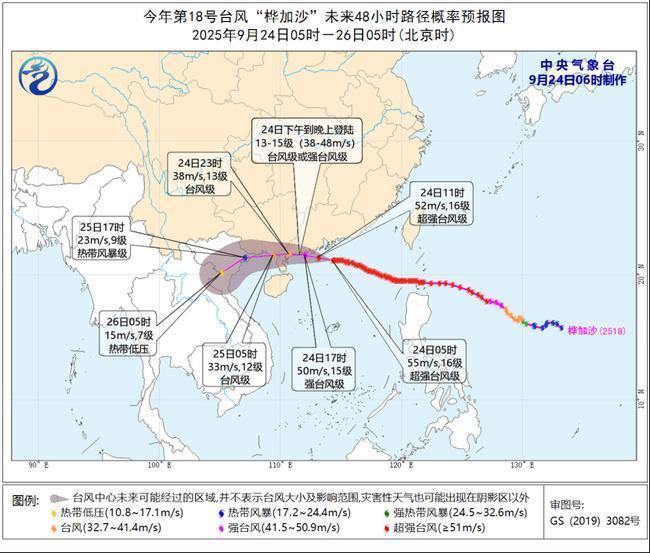 大風預報:24日08時至25日08時,巴士海峽、南海大部、西沙羣島、中沙羣島、南沙羣島、東沙羣島及黃巖島附近海域、台灣海峽、台灣以東洋麪、東海南部、北部灣、瓊州海峽、福建沿海、廣東南部地區及沿海、珠江口區、海南島沿海、廣西沿海、台灣島沿海將有6-9級大風、陣風10-11級,其中,廣東沿海和南海北部的部分海域風力有10-13級、陣風14-15級,颱風中心經過的附近海域或地區風力可達14-15級、陣風16-17級。