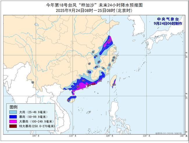 預計,9月24日08時至25日08時,廣東大部、廣西東部和南部、福建東部和南部、海南島北部和西部、台灣島東部、江蘇中部、安徽中南部、湖北東部、江西北部、東部和西南部、浙江東部以及新疆沿天山一帶東部、雲南西南部等地部分地區有大到暴雨,其中,廣東中南部、福建東南部、海南島西部、台灣島東南部、江蘇中部、安徽中部等地部分地區有大暴雨,廣東東南部沿海和西部等地局地特大暴雨(250~270毫米)。上述部分地區伴有短時強降水(最大小時降雨量20~50毫米,局地可超過70毫米),局地有雷暴大風等強對流天氣。