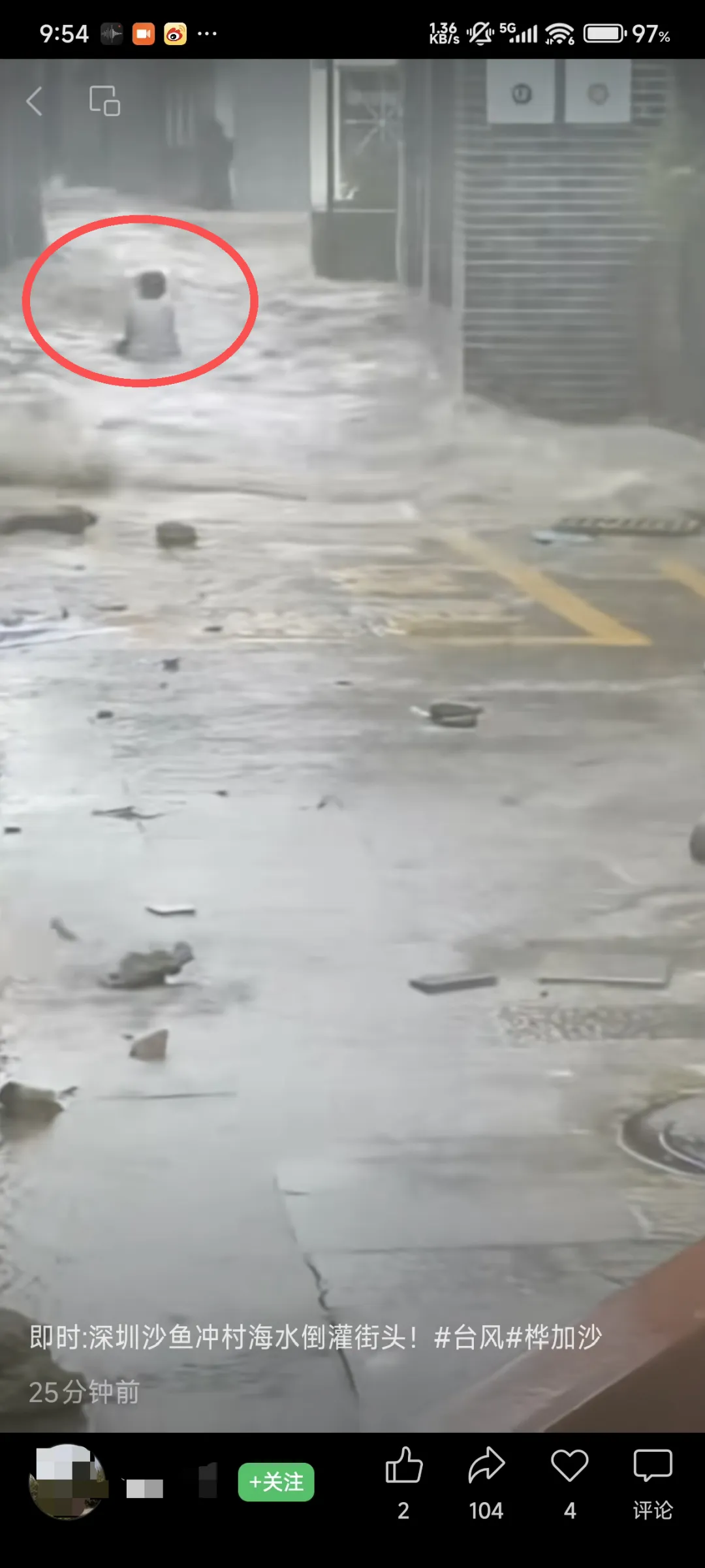 受超強颱風“樺加沙”影響,9月23日18時至24日8時,深圳最大陣風15級(50.4米/秒,大鵬新區七娘山站)。9月24日上午,有網民發視頻稱,受颱風影響,大鵬新區葵涌土洋社區的沙魚涌村有海水倒灌進了街頭,畫面中疑似有“人”被水衝倒,相關情況迅速引發網民關注。