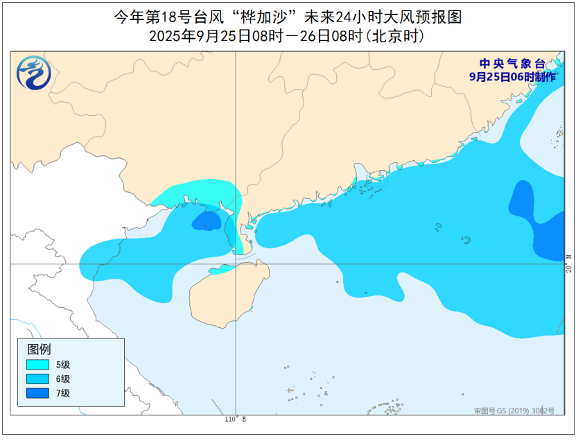大風預報:25日08時至26日08時,南海北部、北部灣、廣東沿海及西南部地區、珠江口區、廣西沿海將有6-7級、陣風8-9級的大風,颱風中心經過的附近海域或地區風力可達8級、陣風9-10級。