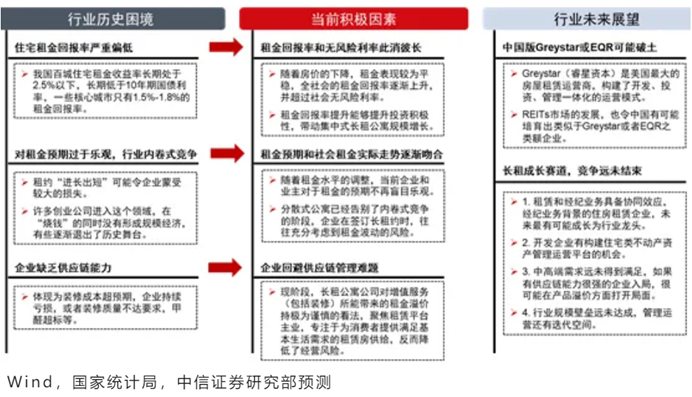 中信證券還具體分析提到,影響長租企業發展的一些歷史因素要麼已經消失(例如租金回報率大幅低於無風險利率),要麼有所緩解(例如業主對租金上漲預期高於實際上漲可能),要麼被階段性迴避(例如行業普遍缺乏供應鏈管理能力,於是階段性選擇放棄裝修+長租業務模型)。