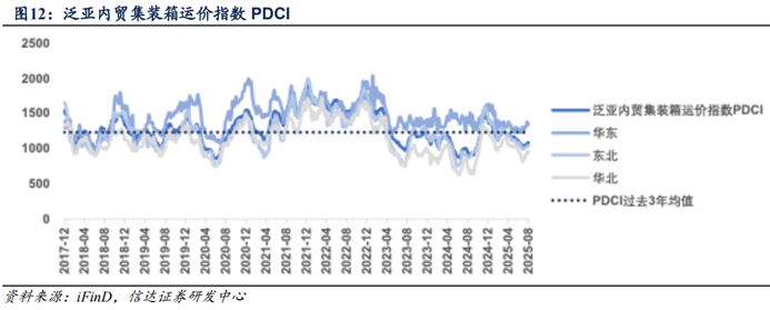 內貿集運方面,2025年8月22日,泛亞內貿集裝箱運價指數PDCI收於1080點,同比增長14.77%,環比2025年8月15日下滑1.01%。