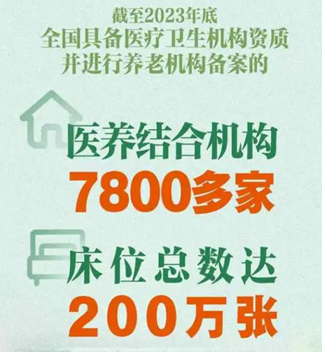 據國家衞健委數據,截至2023年,全國醫療衞生機構和養老服務機構簽約對數8.7萬對,具備醫療衞生機構資質並進行養老機構備案的醫養結合機構7800多家,牀位200萬張。