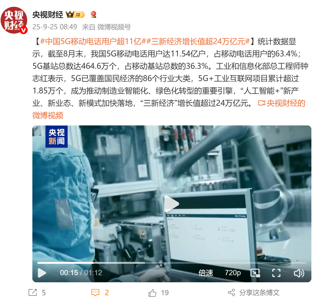 我國 5G 移動電話用户超 11 億,已建成全球規模最大共建共享網絡