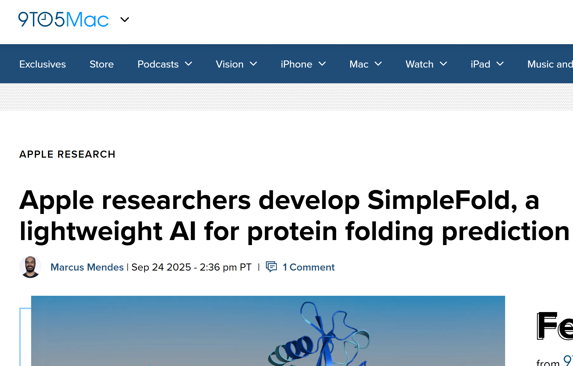 【環球網科技綜合報道】9月25日消息,據海外科技媒體 9to5Mac報道,蘋果公司研究團隊對外發布輕量級蛋白質摺疊預測人工智能模型SimpleFold。該模型創新性採用流匹配方法,替代傳統模型中多序列比對等複雜模塊,在保障預測性能的同時,顯著降低計算成本,為更多科研團隊開展蛋白質相關研究創造有利條件,有望進一步推動藥物研發與新材料探索進程。