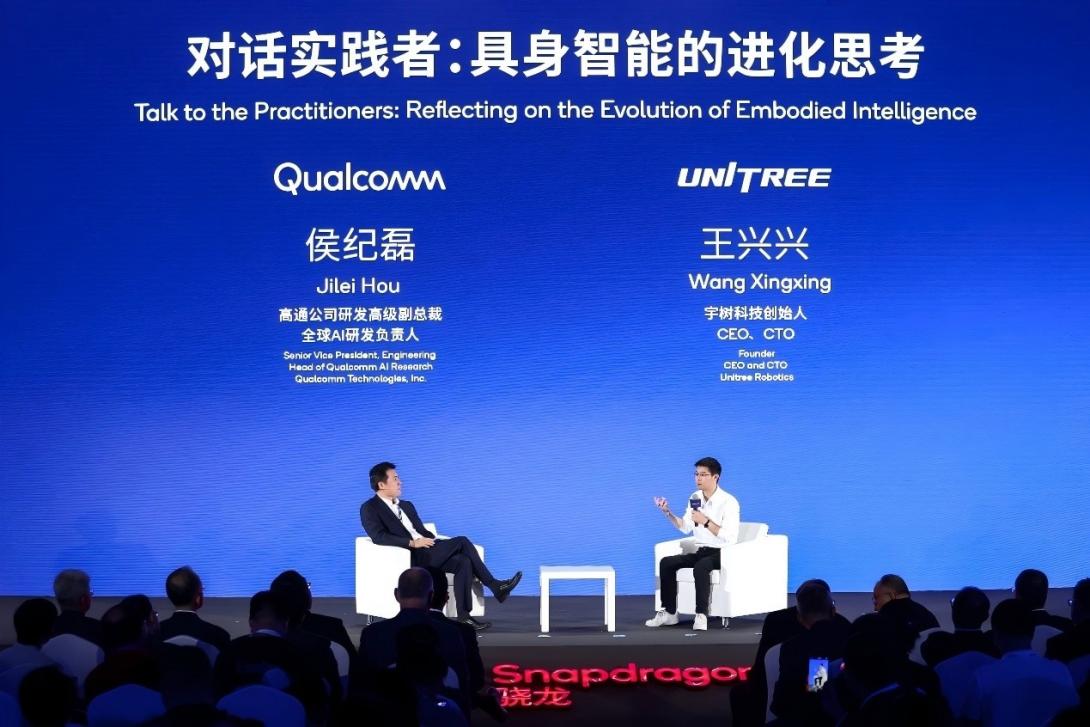 具身智能作為智能體AI向物理形態的落地路徑之一,成為峯會熱議話題。高通公司研發高級副總裁、全球AI研發負責人侯紀磊與宇樹科技創始人、CEO兼CTO王興興圍繞“具身智能的進化思考”展開對談。王興興就人形機器人從今天的產品演示到後續的規模化交付,展望了他對未來的產品里程碑和應用場景的規劃,提出通信連接創新對人形機器人發展至關重要,而機器人的移動性和空間限制對芯片算力與功耗控制提出更高要求;他認為,具身智能的未來需要產業開放合作與共同創新,以推動行業進階。