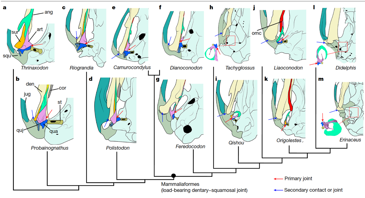 哺乳動物能咀嚼食物、聽到聲音,離不開頜關節與中耳聽小骨的協同作用。哺乳動物與爬行動物的一個根本區別在於下巴關節。爬行動物的下頜關節骨同時也是傳音結構,而哺乳動物則演化出全新的下頜關節,將聽覺與咀嚼功能分開,實現了“專物專用”,這一分離是界定哺乳動物的關鍵特徵。但受化石材料稀缺影響,這一演化過程的細節始終成謎。