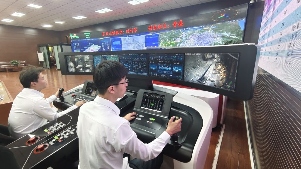 在位於陽泉市的華陽新材料科技集團一礦調度中心,透過大屏幕,可以看到井下割煤機緩緩開動,黑得透亮的煤塊掉落到傳送皮帶上,順着皮帶輸送到地面,井下設備協同運轉一目瞭然。