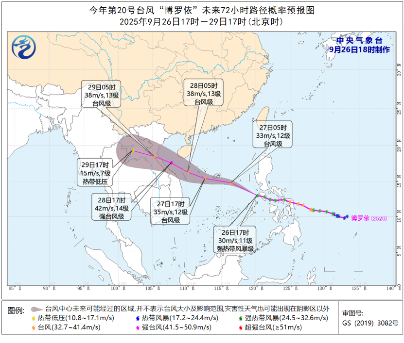 中央氣象台於9月26日18時發佈颱風黃色預警。預計,9月26日夜間至30日,受颱風“博羅依”影響,海南島、廣東西南部、廣西南部和西部、雲南東部和南部、貴州西南部等地有大到暴雨,局地大暴雨或特大暴雨。