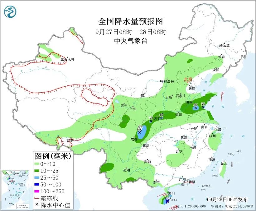 中央氣象台預計,明天,陝西中南部、河南西部和東北部、山東大部、江蘇東部、四川東北部、雲南西部、海南島等地部分地區有中到大雨,其中,四川盆地西北部、海南島東南部等地部分地區有暴雨,局地有大暴雨。