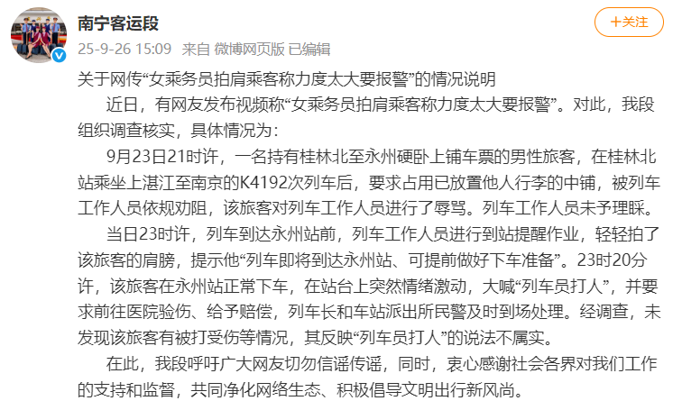 女乘務員拍肩乘客稱力度太大要報警?南寧客運段發佈情況説明