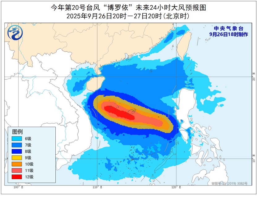 大風預報:26日20時至27日20時,南海大部、巴士海峽、台灣海峽、台灣島沿海、福建沿海、廣東沿海、海南島沿海、北部灣、瓊州海峽將有6-8級、陣風9級的大風,其中,南海中部和東南部的部分海域風力有9-10級、陣風11-12級,颱風中心經過的附近海域風力可達11-12級、陣風13-14級。
