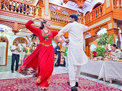 新疆喀什古城一家民宿內的歌舞演出。本報記者 範天培攝