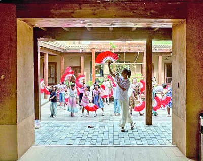 新疆庫車市龜茲小巷的非遺工坊裏,暑期支教大學生正在教孩子們跳中國舞。本報記者 孫金行攝