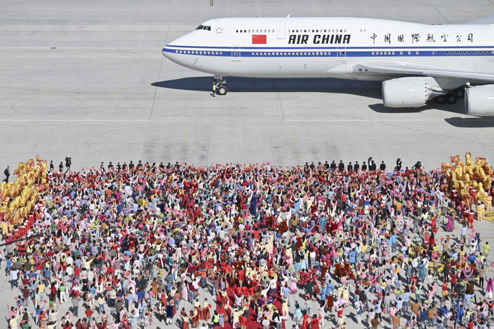 23日14時20分許,習近平總書記乘坐的專機在天山國際機場降落,等候在停機坪的新疆各族各界羣眾熱烈歡呼。習近平總書記走出艙門,向歡迎羣眾揮手致意。習近平總書記走下舷梯時,少先隊員獻上鮮花。