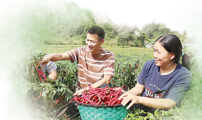 趙應武(右二)與村民一起摘辣椒。