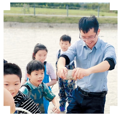 劉松帶領小遊客參加“渾水摸魚”農文旅活動。