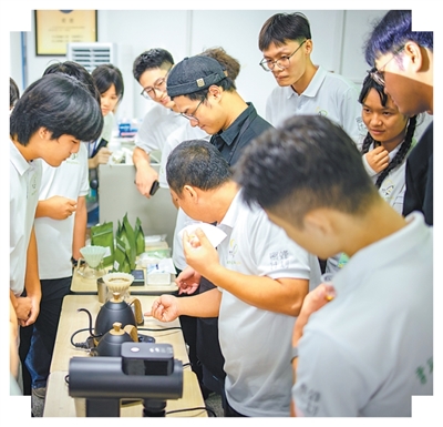 廣州市“鄉村運營青年CEO培育·蜜蜂計劃”培訓班學員學習衝煮咖啡。