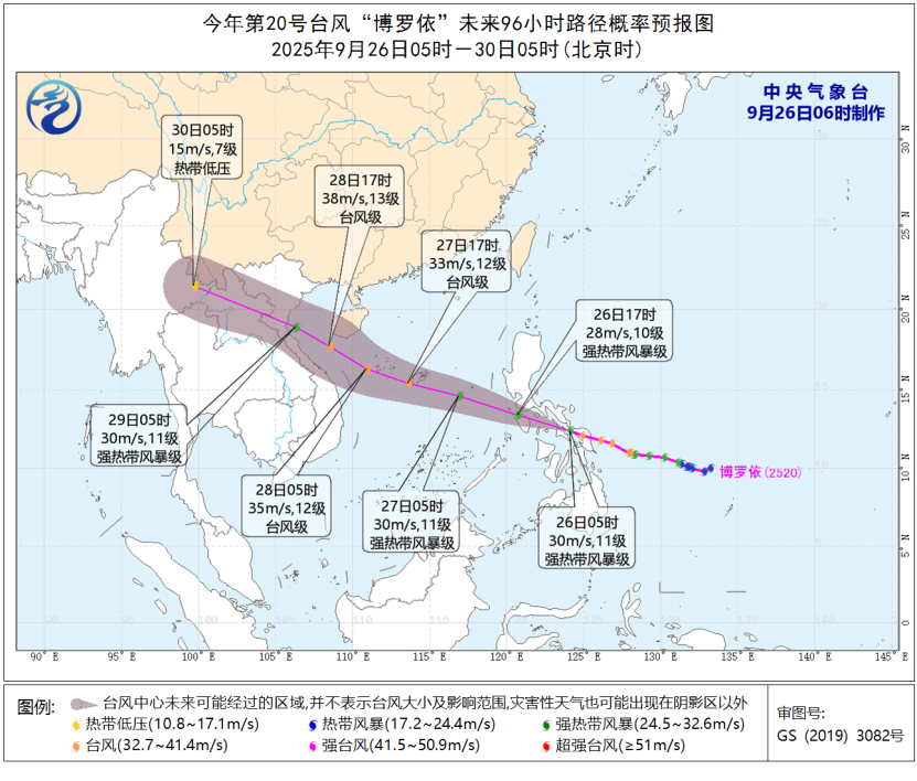 *中央氣象台9月26日6時發佈**颱風藍色預警:*今年第20號颱風“博羅依”的中心已於今天(26日)凌晨1點前後在菲律賓薩馬島東部沿海登陸,登陸時中心附近最大風力有12級(33米/秒),中心最低氣壓為975百帕,今天早晨其強度由颱風級減弱為強熱帶風暴級,早晨5點鐘其中心位於薩馬島西部近海海面上,距離海南省三沙市東偏南方向約1360公里,就是北緯12.4度、東經124.1度,中心附近最大風力有11級(30米/秒),中心最低氣壓980百帕,七級風圈半徑為300至320公里,十級風圈半徑為100至120公里。