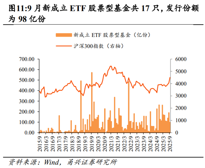 甬興證券在近日發佈的研報中提到,2025年9月新成立17只股票型ETF基金。2025年9月新成立ETF基金31只,2024年9月新成立ETF基金18只;其中,9月新成立ETF基金17只為股票型基金,發行份額98億份。