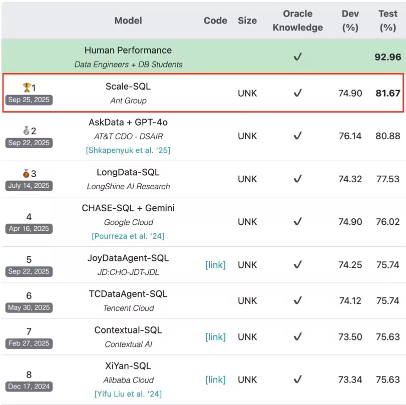【環球網科技綜合報道】9月26日,據全球權威評測基準BIRD-Bech官網,螞蟻數科的數據分析智能體Agentar-SQL超越AT&T(美國電話電報公司)、谷歌雲、騰訊雲、阿里雲等諸多國內外廠商,登頂榜單。這也是中國公司在該榜單上取得的最高成績。