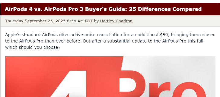 【環球網科技綜合報道】在無線耳機市場,蘋果的AirPods系列一直佔據着舉足輕重的地位。隨着AirPods 4和AirPods Pro 3的相繼推出,消費者們又面臨了一個幸福的煩惱:到底該選哪一款呢?9月26日,根據外媒的最新報道,AirPods 4與AirPods Pro 3之間共擁有25處差異,用户可根據自己的需求按需購買。