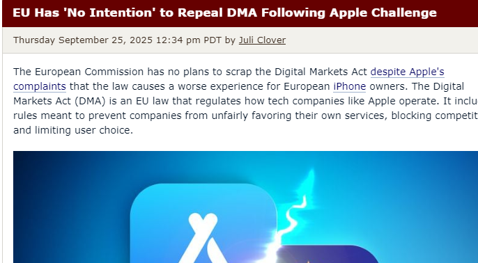 外媒指出,《數字市場法案》作為歐盟的一項重要法律,旨在規範蘋果等科技巨頭的運營行為,防止其不公平地偏袒自身服務、封鎖競爭對手以及限制用户選擇。然而,自該法案實施以來,蘋果公司便幾乎對其每一條規定都提出了異議。