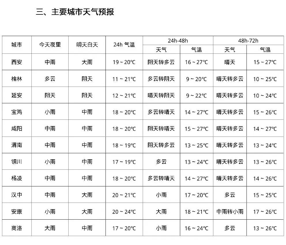 今天晚上至明天白天西安市有一次降雨天氣過程,量級以小到中雨為主,南部山區大雨。主要降雨時段在今天后半夜至明天中午,過程於明天下午逐漸減弱結束。後期30日後半夜起,西安市還有新一輪降雨天氣。近期西安市降雨偏多,山區土壤濕度處於飽和狀態,需重點防範其可能引發的地質災害、山洪、中小河流洪水、城鄉積澇等次生災害風險,以及造成的道路濕滑、低能見度對交通安全的不利影響。