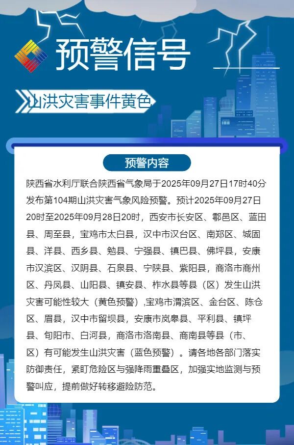 預計2025年9月27日20時至2025年9月28日20時,周至縣厚畛子、板房子等2個鎮街,鄠邑區石井、景區管理局等2個鎮街,長安區灤鎮、太乙、楊莊等3個鎮街,藍田縣湯峪、輞川、葛牌、藍橋等4個鎮街,有大雨到暴雨,前期累計降雨大,發生山洪災害可能性較大(11個鎮街黃色預警),灞橋區洪慶街道,臨潼區斜口、驪山、代王、馬額、穆寨等5個鎮街,周至縣竹峪、陳河、馬召、樓觀、王家河、集賢、九峯等7個鎮街,鄠邑區蔣村鎮,長安區子午、王莽、引鎮等3個鎮街,藍田縣焦岱、小寨、九間房、灞源、厚鎮、華胥、洩湖、玉山等8個鎮街,有中到大雨,前期累計降雨大,可能發生山洪災害(25個鎮街藍色預警)。
