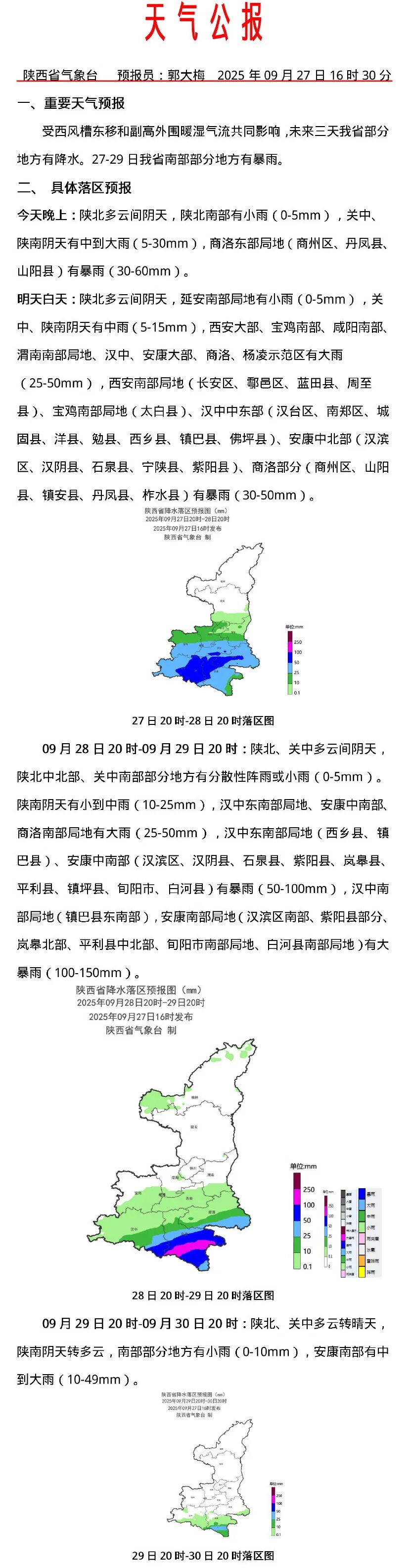 受低槽和副熱帶高壓外圍暖濕氣流共同影響,預計9月27日20時至28日20時,西安大部、寶雞南部、咸陽南部、渭南南部局地、漢中、安康大部、商洛、楊淩示範區有大雨(25~50毫米),其中西安南部局地(長安區、鄠邑區、藍田縣、周至縣)、寶雞南部局地(太白縣)、漢中中東部(漢台區、南鄭區、城固縣、洋縣、勉縣、西鄉縣、鎮巴縣、佛坪縣)、安康中北部(漢濱區、漢陰縣、石泉縣、寧陝縣、紫陽縣)、商洛部分(商州區、山陽縣、鎮安縣、丹鳳縣、柞水縣)有暴雨(50~80毫米)。上述部分地區伴有短時強降水(最大小時降雨量10~20毫米,個別點30毫米以上)。前期關中、陝南累計雨量大,此次降水疊加致災風險高。發生山洪、地質災害、中小河流洪水、城鄉積澇、農田漬澇等氣象風險較高,上述區縣及其相鄰區縣也需加強災害隱患點等排查,做好次生災害防禦以及交通、旅遊、山區、景區、城市安全管理等工作。