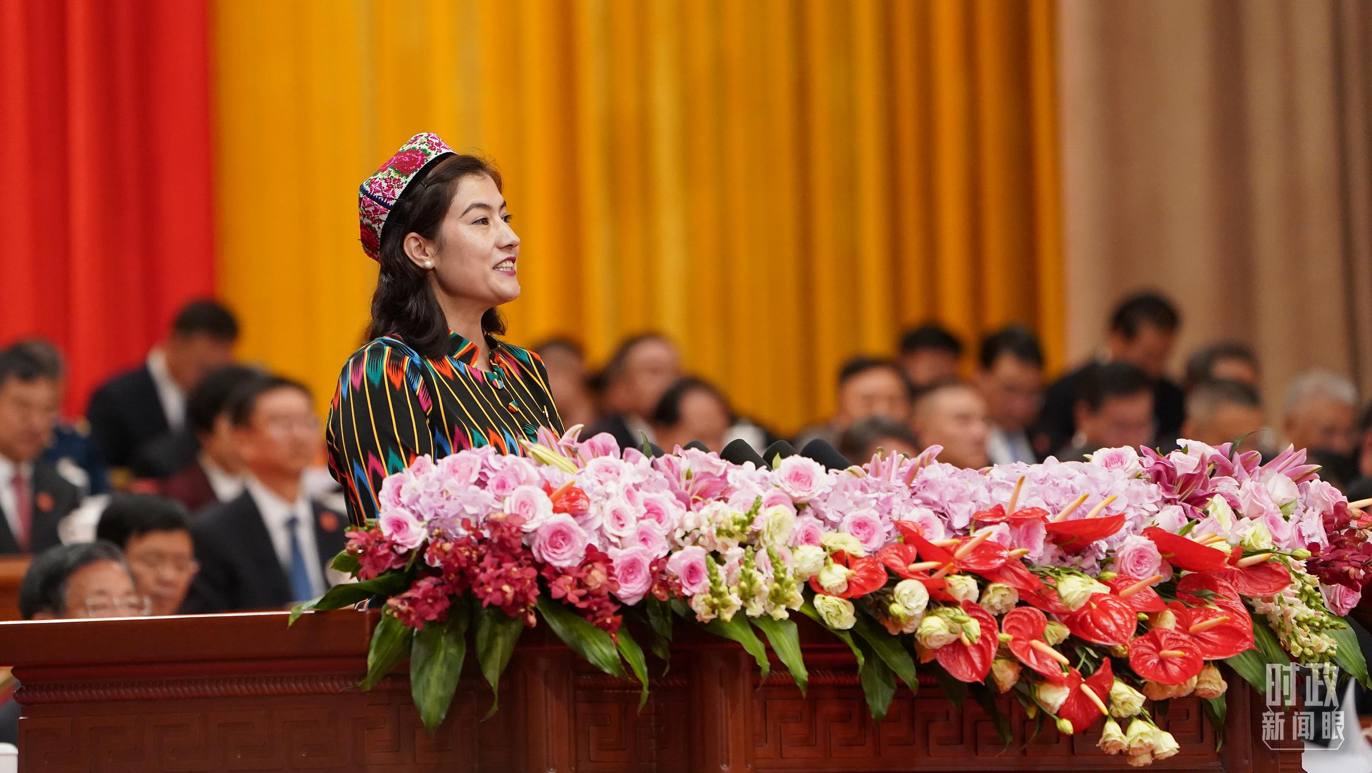 喀什地區巴楚縣童夢幼兒園園長艾米拉古麗·阿不都作為維吾爾族羣眾代表發言。她曾見證了自己所在的幼兒園由低矮的土坯房變成標準化幼兒園,成為鄉村最漂亮的建築。