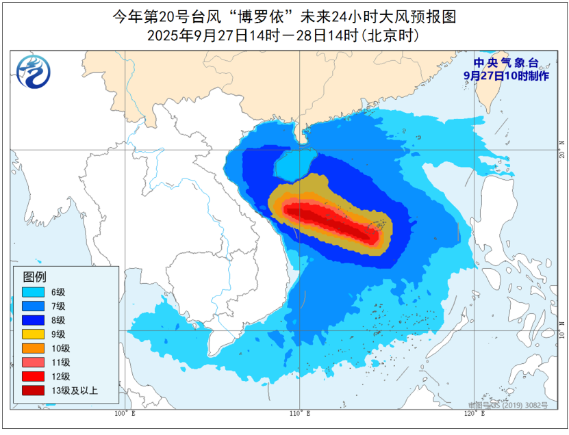 中央氣象台今天10時繼續發佈颱風黃色預警:今年第20號颱風“博羅依”(強熱帶風暴級)已於今天(27日)上午加強為颱風級,上午8點鐘其中心位於海南省三沙市(西沙永興島)東南方440公里的南海中東部海面上,中心附近最大風力有12級(33米/秒)。