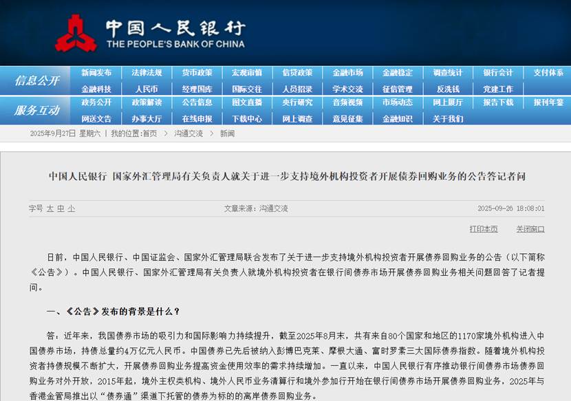 根據答記者問,近年來,我國債券市場的吸引力和國際影響力持續提升,截至2025年8月末,共有來自80個國家和地區的1170家境外機構進入中國債券市場,持債總量約4萬億元人民幣。中國債券已先後被納入彭博巴克萊、摩根大通、富時羅素三大國際債券指數。隨着境外機構投資者持債規模不斷擴大,開展債券回購業務提高資金使用效率的需求持續增加。