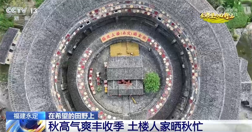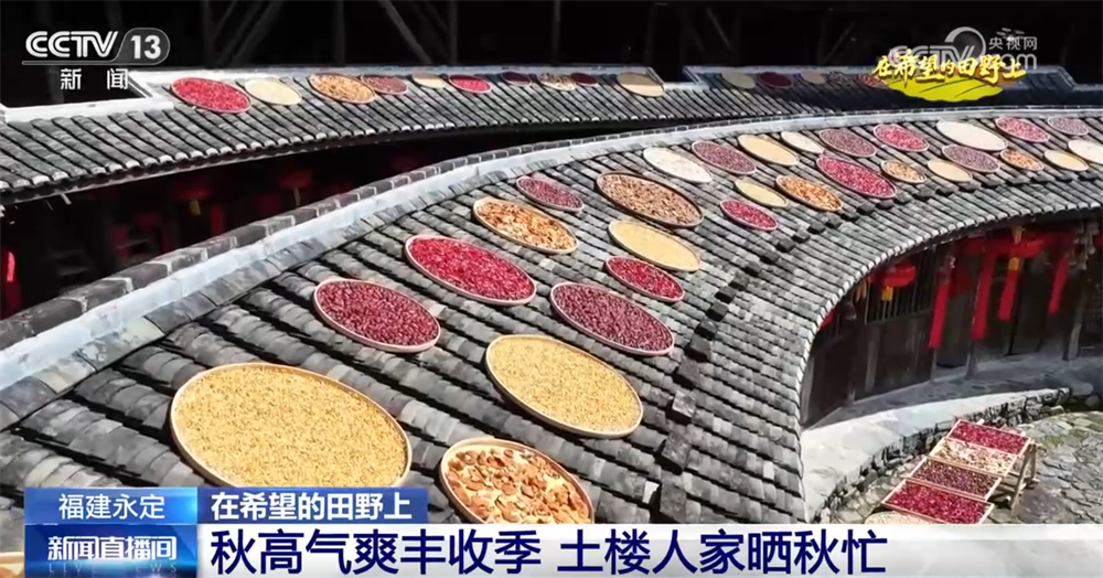 由於永定土樓所在的區域多為山地,而且秋冬季節濕度大,因此為了延長農作物的儲存時間、避免黴變,每年的秋分節氣前後,土樓人家都要把收穫的作物攤在土樓裏晾曬。大家看,在屋檐上擺滿了一個個圓圓的竹匾,這些各式各樣顏色鮮豔的農作物與古樸的土樓相映成趣,構成了一幅獨具客家風情的秋日豐收畫卷。