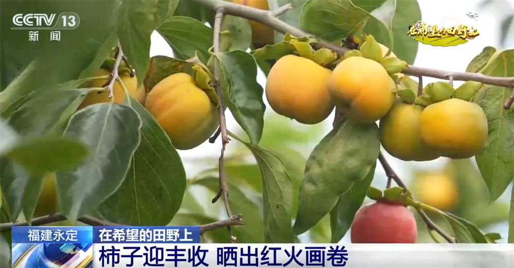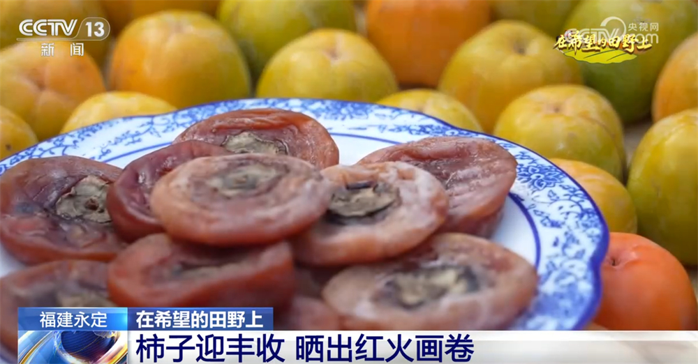 土樓曬秋都曬些什麼呢?大家來看,在曬架上,有辣椒、陳皮、花生、紅棗等。在這個竹匾裏,還曬着一個個顏色鮮豔的柿子。龍巖市的永定區被稱為“中國華東柿子之鄉”,這裏種植了六萬多畝的柿子,年產量達5.8萬噸。這段時間,漫山遍野的柿子開始進入成熟期,橙紅色的果實就像一盞盞小燈籠綴滿枝頭。客家人會把一部分柿子放在竹匾裏,曬上一到兩週,製作成柿餅,一口下去,軟糯香甜。