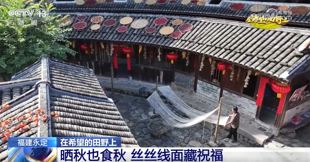 不僅要曬秋,按照當地的傳統,秋分節氣前後還要食秋,吃的就是當地的一些傳統特色美食。這是傳統的客家線面,這道美食的特點就是細如絲線,因此“拉線”是製作線面最核心的一步。老鄉們要將線面纏繞在一根固定的竹竿上,再握住另一根竹竿,向外拉抖麪條,直到把小拇指粗的麪條全部拉到絲線般細為止。接着,還要把線面掛在面架上晾曬,千絲萬縷的線面在陽光下細若銀絲,遠遠看過去,彷彿一層層白紗。因為客家話的“面”與“命”的發音相似,因此生日或者有喜事的時候,客家人都要吃線面,並且煮線面都不剪斷,寓意“長命百歲”。