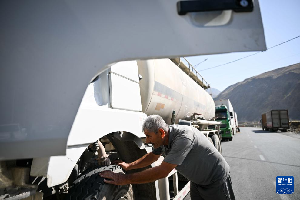 9月11日,在塔吉克斯坦卡拉依洪姆村附近,司機圖拉洪檢查車輛。 新華社記者 李任滋 攝
