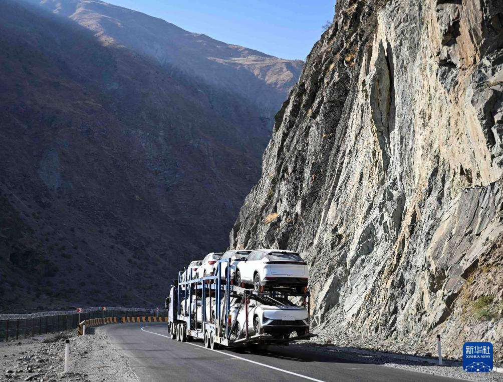 9月11日,一輛載有中國品牌汽車的籠車行駛在塔吉克斯坦卡拉依洪姆村附近的中塔公路二期路段上。 新華社記者 李任滋 攝