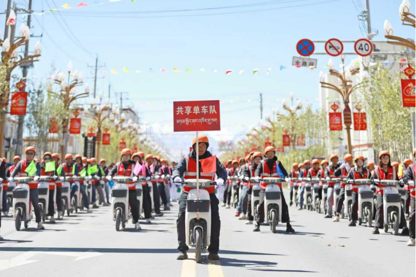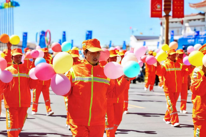 緊隨其後,一個個充滿象徵意義的方隊依次登場——常年堅守在護衞幹部羣眾身心健康的第一線的醫護方隊;守護阿里潔淨,共繪城市靚麗畫卷的環衞工人方隊;把綠色低碳和輕鬆便捷帶到獅泉河畔的共享單車方隊;雪域之光、青春洋溢的學生方隊以及身着絢麗民族服飾的各縣代表方隊款款走來,一張張笑臉,在藍天的映襯下,繪出民族團結的生動畫卷。