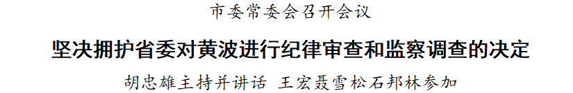 9月28日,省委常委、市委書記胡忠雄主持召開市委常委會會議,通報黃波涉嫌嚴重違紀違法,目前正接受省紀委監委紀律審查和監察調查。與會同志一致表示,堅決擁護省委決定,堅決擁護省紀委監委決定。