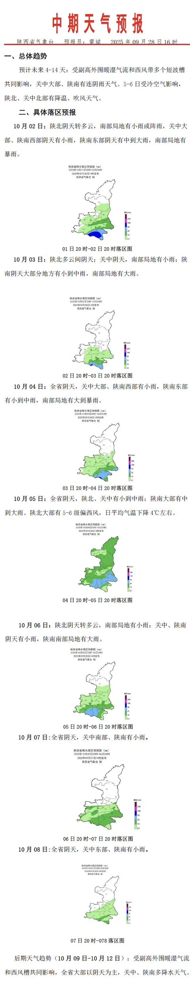 預計未來4-14天:受副高外圍暖濕氣流和西風帶多個短波槽共同影響,關中大部、陝南有連陰雨天氣。5-6日受冷空氣影響,陝北、關中北部有降温、吹風天氣。