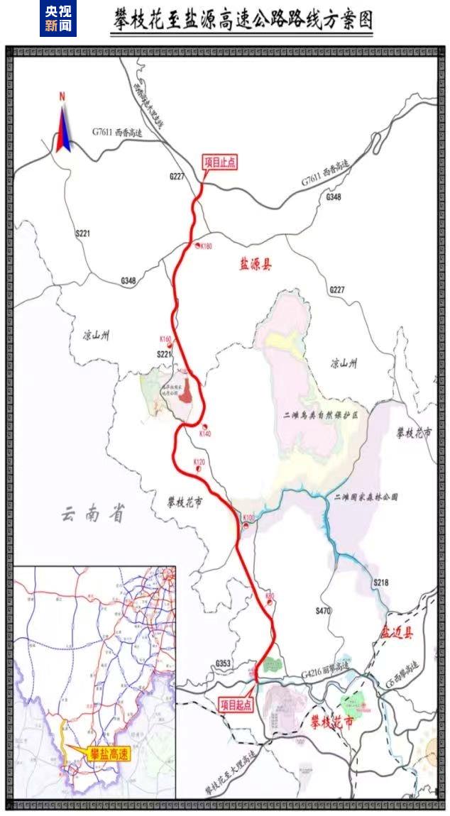 項目起於涼山州鹽源縣棉椏鎮,止於攀枝花市仁和區太平鄉,全長約131.3公里,其中攀枝花境內約86.3公里,涼山州境內約45公里。全線採用雙向四車道高速公路標準建設,設計時速80公里,路基寬度25.5米,設橋樑67座、隧道20座、互通式立交10處,橋隧比約80%。