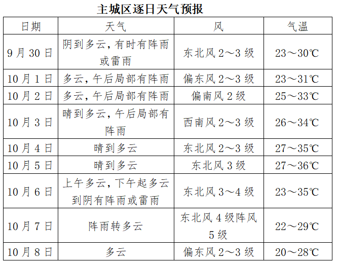 國慶假期氣象條件總體利於外出旅遊 ,其中9月29-30日、10月6-7日有明顯陣雨或雷雨,需防範局地短時強降雨對交通出行、旅遊安全等的不利影響。