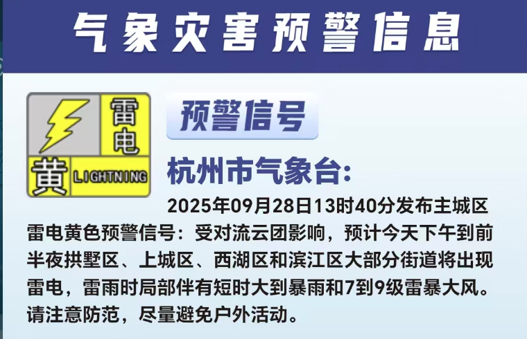剛剛,杭州市氣象台今天主城區雷電黃色預警信號:受對流雲團影響,預計今天下午到前半夜拱墅區、上城區、西湖區和濱江區大部分街道將出現雷電,雷雨時局部伴有短時大到暴雨和7到9級雷暴大風。請注意防範,儘量避免户外活動。