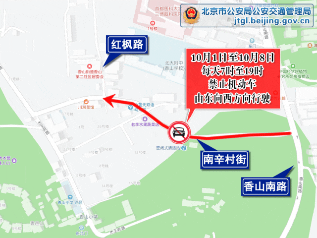 2025年10月1日至10月8日,每天7時至19時,海淀區南辛村街(紅楓路至香山南路段)禁止機動車由東向西方向行駛。