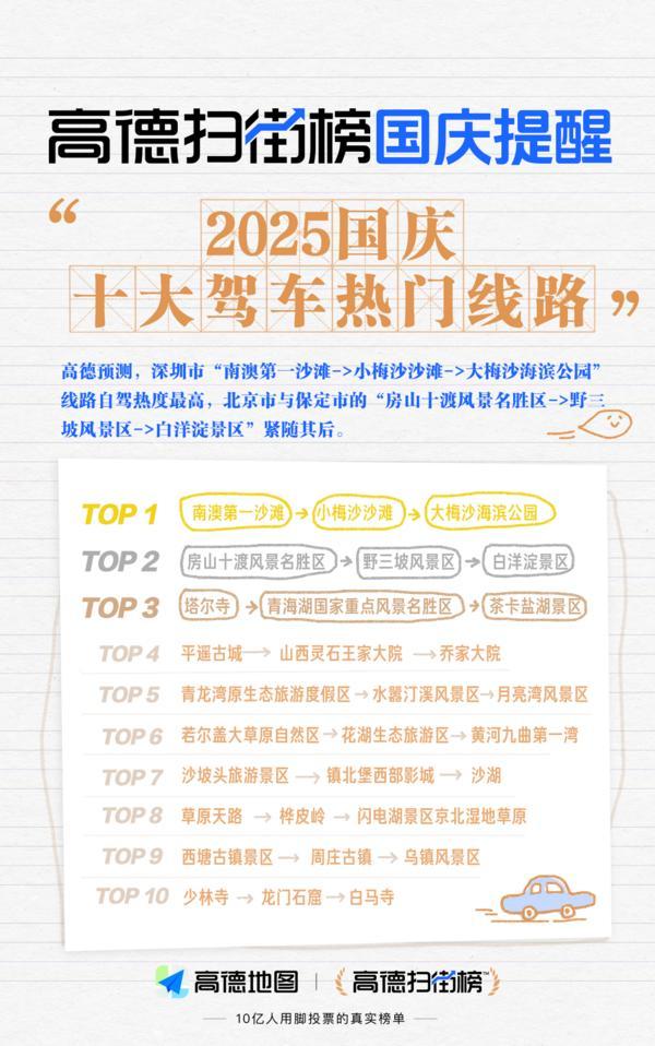 今天,2025年十一假期全國駕車遊熱門路線TOP10也正式出爐。深圳市“南澳第一沙灘->小梅沙沙灘->大梅沙海濱公園”路線位居榜首;北京市與保定市的“房山十渡風景名勝區->野三坡風景區->白洋淀景區”排名第二。