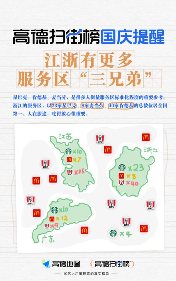 近年來,越來越多服務區引入了連鎖品牌。比如,浙江省的服務區在傳統的嘉興大肉粽之外,入駐了更多品牌化連鎖化餐飲集團。浙江服務區憑藉總計23家星巴克、8家麥當勞、40家肯德基,成為服務區“標準化擔當”。而江蘇、廣東緊隨其後,凸顯沿海省份服務區商業化運營優勢。從分佈看,星巴克偏愛浙蘇粵,肯德基、麥當勞則“廣撒網”,覆蓋範圍更廣。