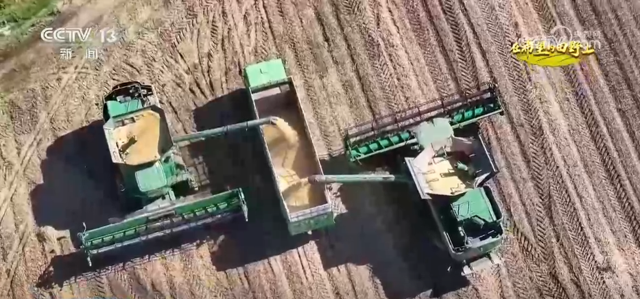 在北大荒集團鶴山農場的大豆田裏,先進的大型聯合收穫機正在高效作業,收割、脱粒、秸稈粉碎還田全靠它,滿載金黃豆粒的運輸車輛在田間穿行。
