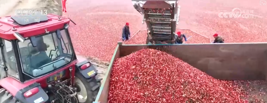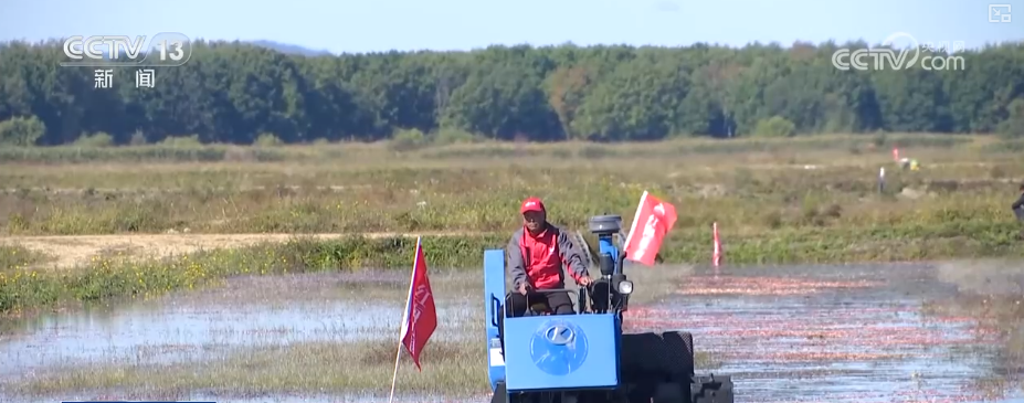 在位於黑龍江撫遠市的蔓越莓種植基地,水上打果機的應用讓採摘更加高效。工人們先將蔓越莓田裏注滿水,然後駕駛打果機在水中穿梭作業。機械臂攪動間,一顆顆紅色的果實脱離枝蔓漂浮到水面上,工人們利用專業工具將蔓越莓聚攏到一起完成收穫。